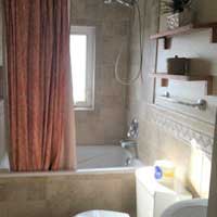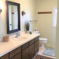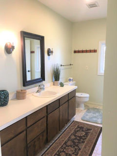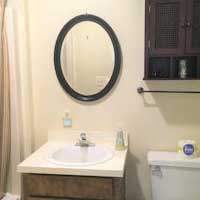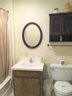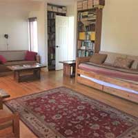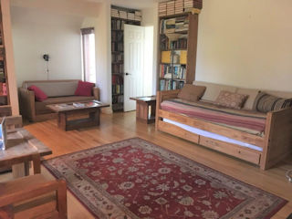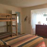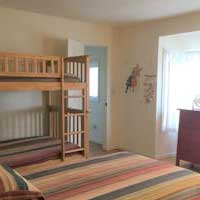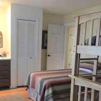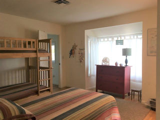 The library and children's room share a bathroom. The library has a sleep sofa that pulls out into a double bed, and a sofa that pulls out into two twin beds (the trundle). The living room has a queen pullout bed.