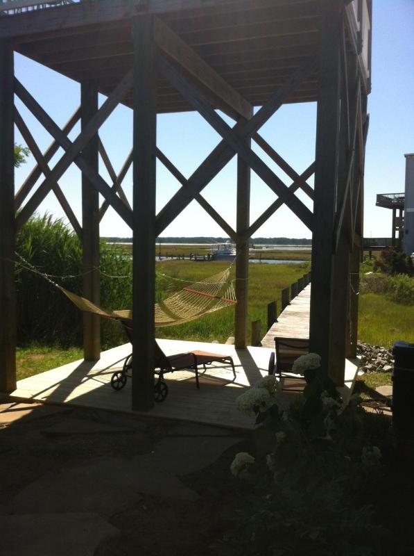 Stairs from the first-floor center hall balcony provide easy access down to a ground-level deck and to the dock. This also makes the house more accessible to Eureka! if you are using both houses. There is an enclosure under the balcony where you can store bikes and beach gear.