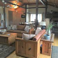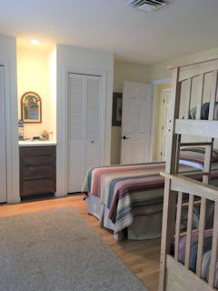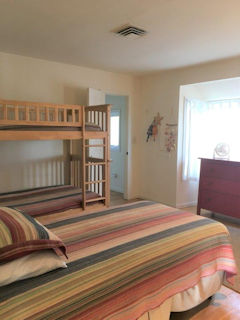 The library and children's room share a bathroom. The library has a sleep sofa that pulls out into a double bed, and a sofa that pulls out into two twin beds (the trundle). The living room has a queen pullout bed.
